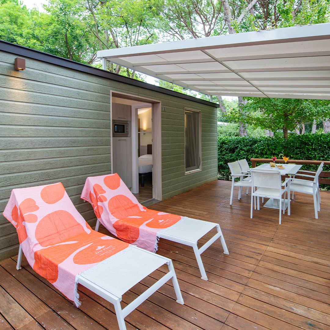 Lo Chalet Natura Four Beds combina funzionalità e comfort in spazi ben distribuiti con due camere e due bagni. La cucina attrezzata e il soggiorno con TV offrono tutti i servizi per un soggiorno rilassante. La terrazza in legno arredata, il climatizzatore e la spiaggia riservata rendono l’esperienza comoda e piacevole in ogni momento della giornata.
