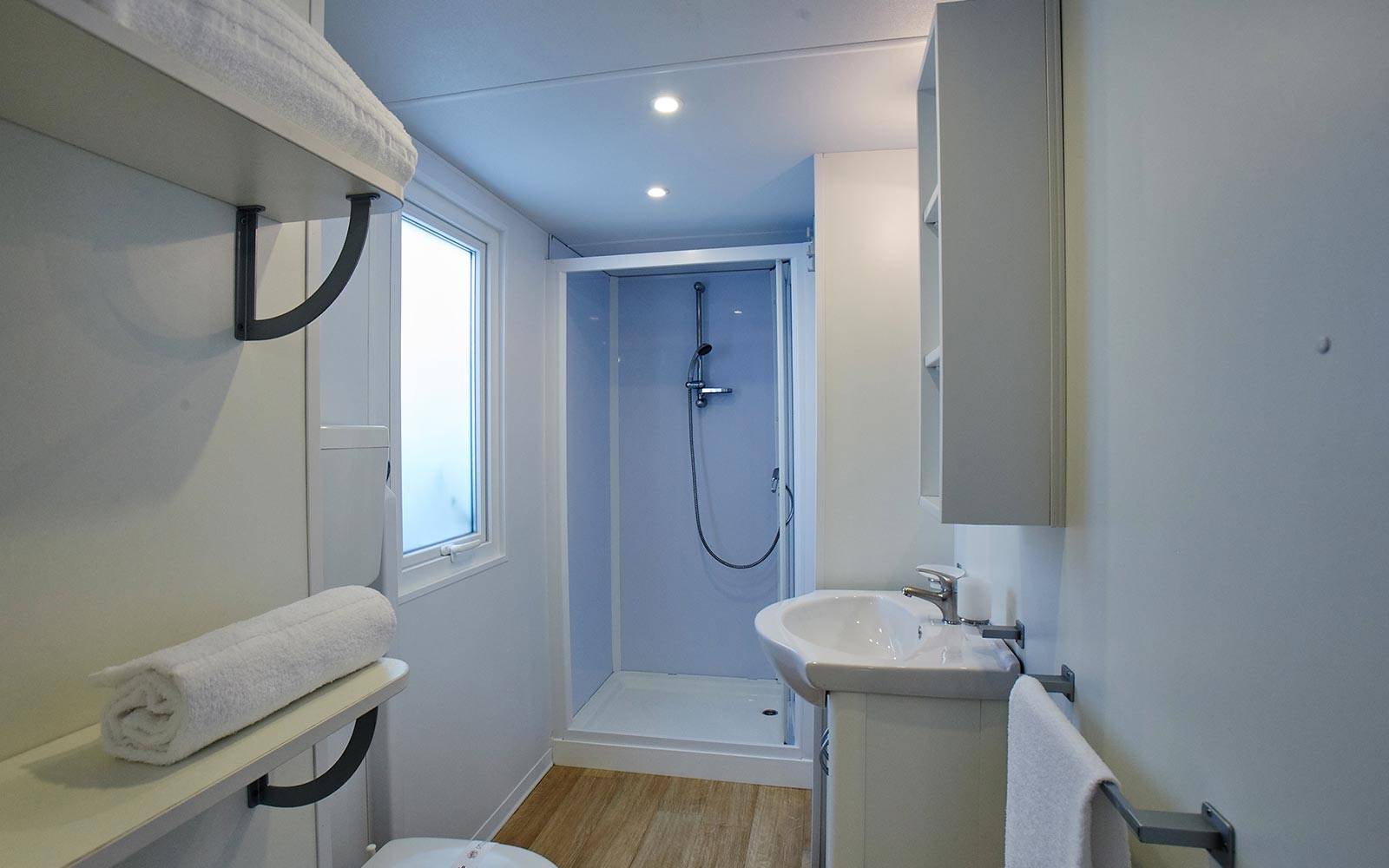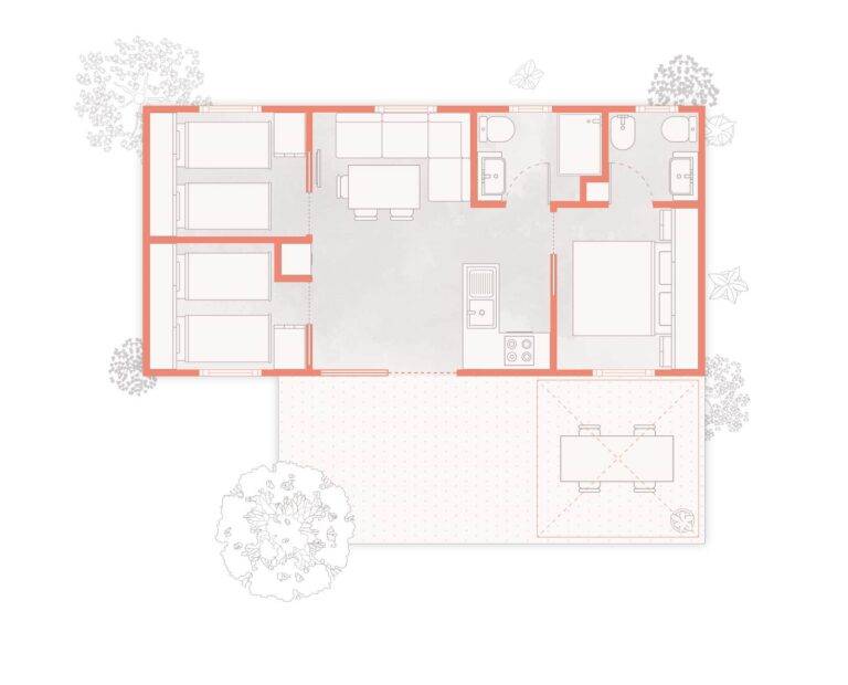 Con tre camere e due bagni, lo Chalet Sole Six Beds II garantisce comfort e praticità anche ai gruppi più numerosi. Gli spazi luminosi e la grande terrazza affacciata sul verde invitano a godere appieno della vita all’aria aperta, tra relax e libertà.